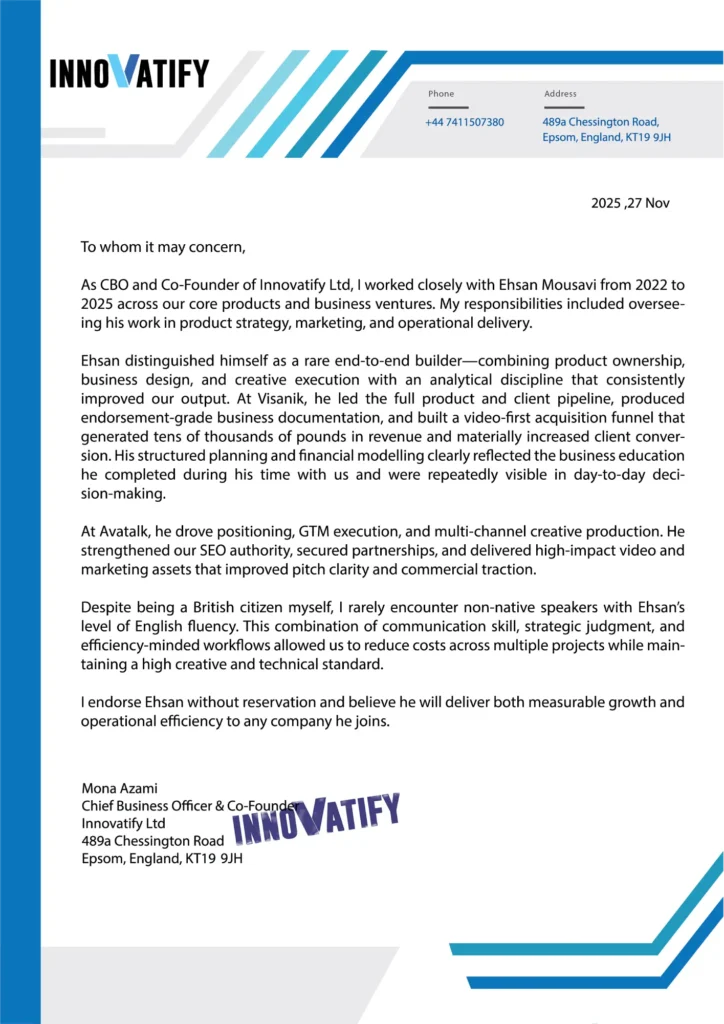 Her letter highlights the qualities she valued most in our collaboration: my ability to act as a hybrid builder across product, strategy, and creative execution; my reliability in high-stakes deliveries; and the measurable results produced through our acquisition funnels and client-facing work.
