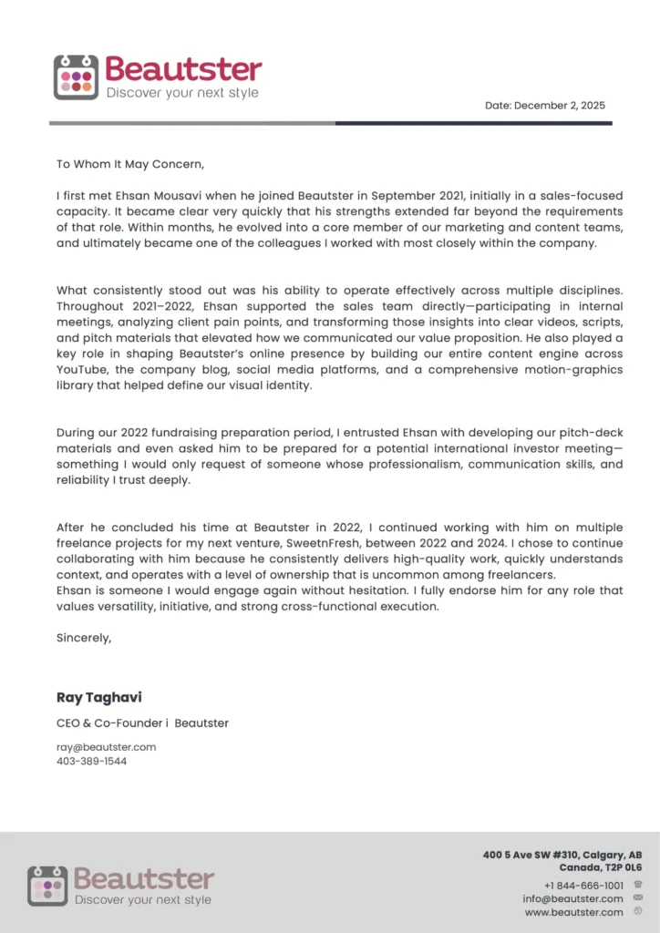 His reference emphasizes the trust he placed in me: transforming insights into content, shaping Beautster’s visual identity, and later being invited to continue working with him on new ventures.