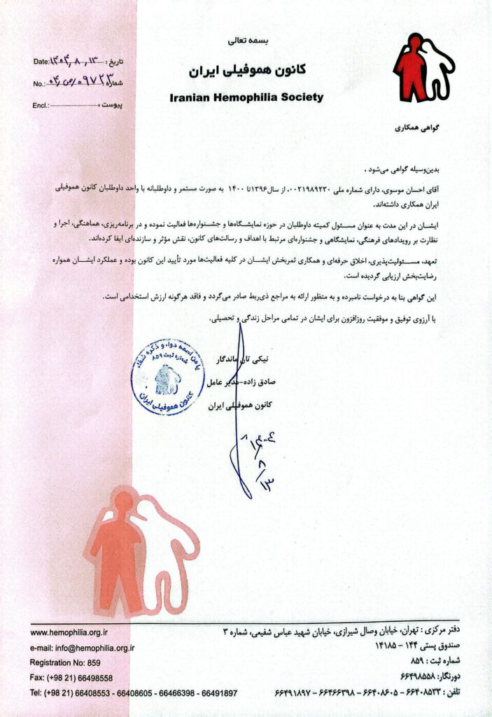 “This certificate certifies that Mr. Ehsan Mousavi, holding National ID No. 0021989230, has continuously and voluntarily cooperated with the Volunteer Unit of the Iranian Hemophilia Society from 2017 to 2021 (1396 to 1400).