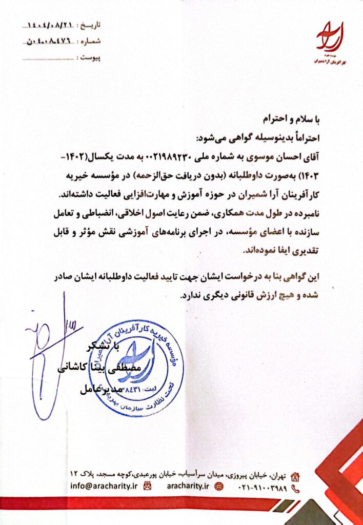 This is to certify that Mr. Ehsan Mousavi, holding National ID No. 0021989230, has been active voluntarily (without receiving remuneration) for a period of one year (2023–2024 / 1402–1403) at the Ara Entrepreneurs Shemiran Charity Institute in the field of Education and Skills Development.