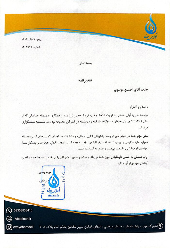 The Avayeh Hamdeli Charity Institute takes pride and expresses sincere appreciation for the valuable presence and sincere cooperation of Mr. Ehsan Mousavi who has been with us since 2022 (1401) with a responsible, dedicated, and voluntary spirit.